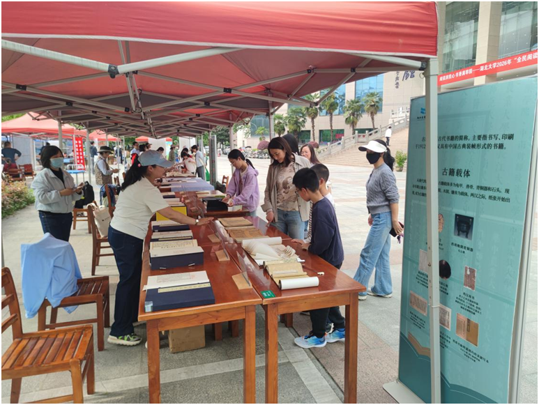 在求索广场,古籍科普展示区成为“文化打卡点”。省图书馆工作人员展示了卷轴装、经折装、旋风装、蝴蝶装、包背装、毛装、线装、平装等8种古籍装帧形式,师生可亲手触摸、直观了解其演变与工艺。现场,工作人员同步推介了古籍特色资源库,引导师生便捷获取省图书馆的古籍数字资源,让“沉睡”的古籍通过数字化传播走进日常学习。